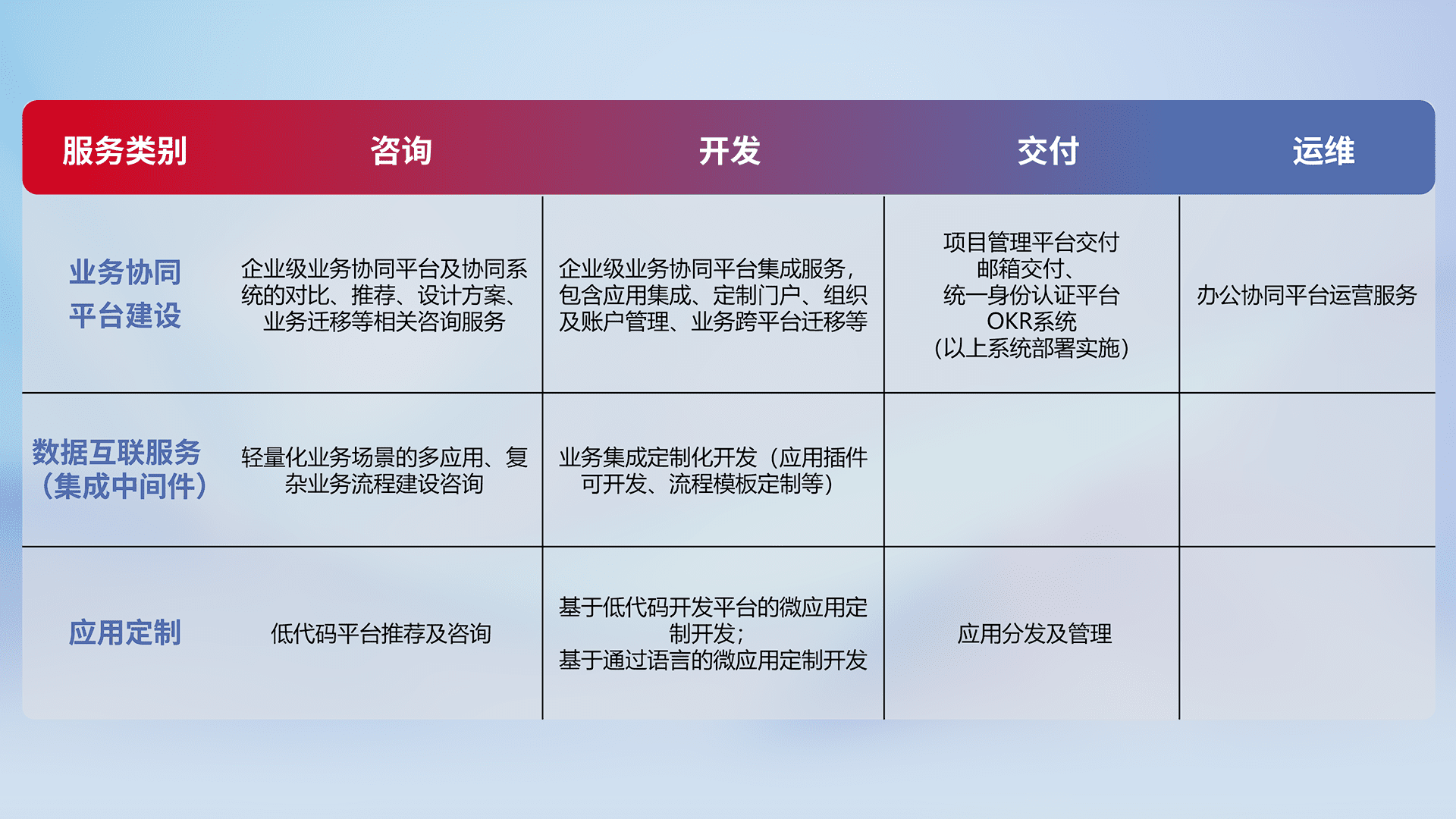 针对钉钉、、、企微、、IDaas等平台级产品提供产品的规划、、、、方案、、交付、、、定制化开发等服务,,实现如统一协同办公、、、、智能客户服务、、、混合会议管理、、智能数据查询、、、等业务场景,,,实现数字化转型。。。。