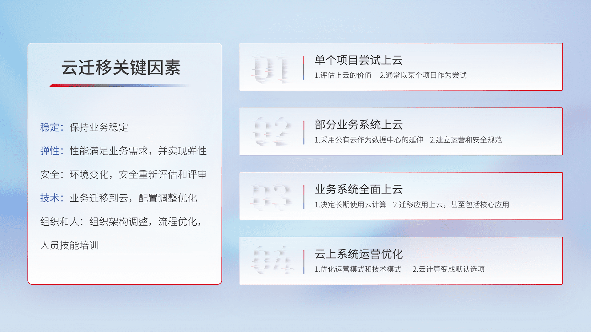 结合实际业务,,,,从规划设计、、、、云平台选型、、、、云原生改造、、、、数据迁移、、集成交付,,迁移全过程为客户识别最佳上云路径,,做好风险识别管理,,,设计网络架构、、、身份权限、、安全审计合规、、、操作审计、、日志审计、、监控告警策略、、多站点容灾设计等,,,对云上基础设施进行整体规划,,,,提升IT治理水平,,以满足弹性、、、、高可用、、、高性能的需求。。。