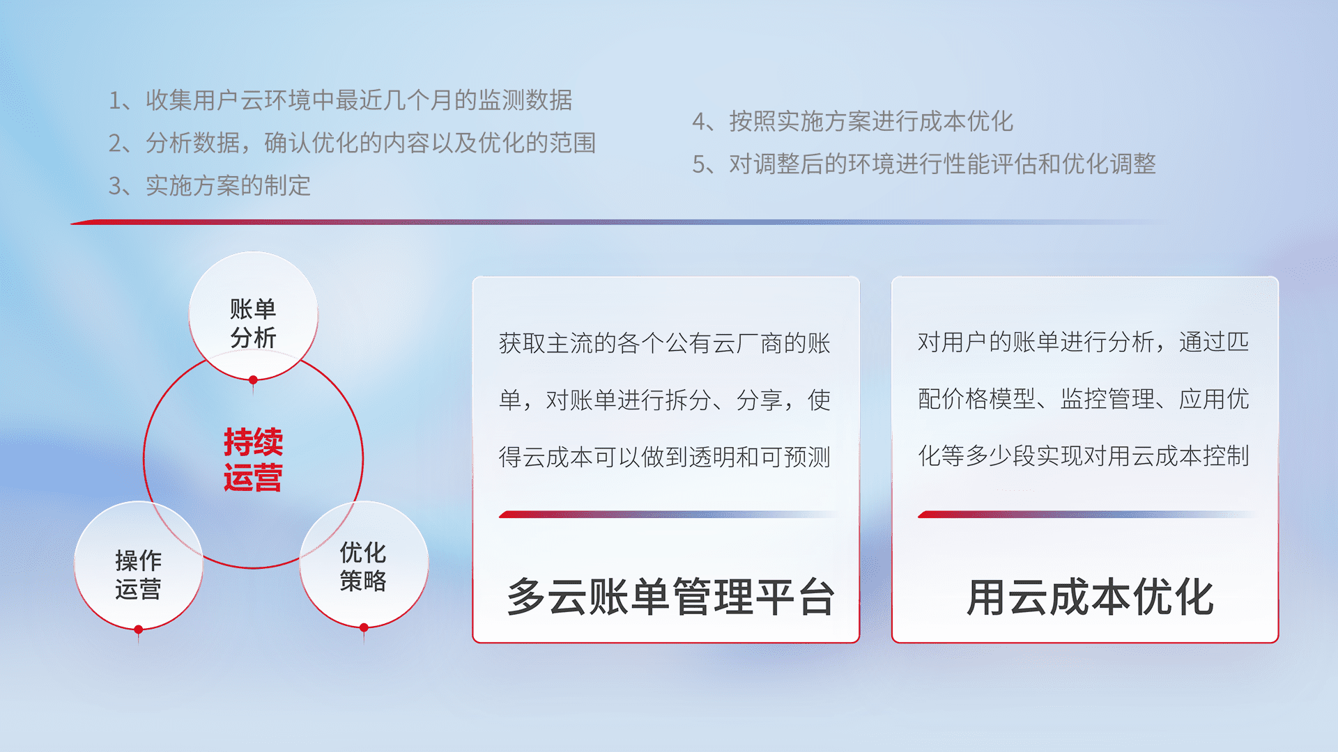 通过多云纳管,,以统一的资源数据模型把客户的云资源进行抽象和封装,,进而实现对多云资源的统一操作,,,,保障云资源管理的可靠性、、稳定性与可用性。。量身定制化运维内容,,,,配置、、开发运维、、、、补丁管理、、、备份、、、、监控、、、、认证和访问管理、、审计和日常巡检等,,,,保障在用云过程中的可靠度,,,稳定度以及高可用率。。。。
