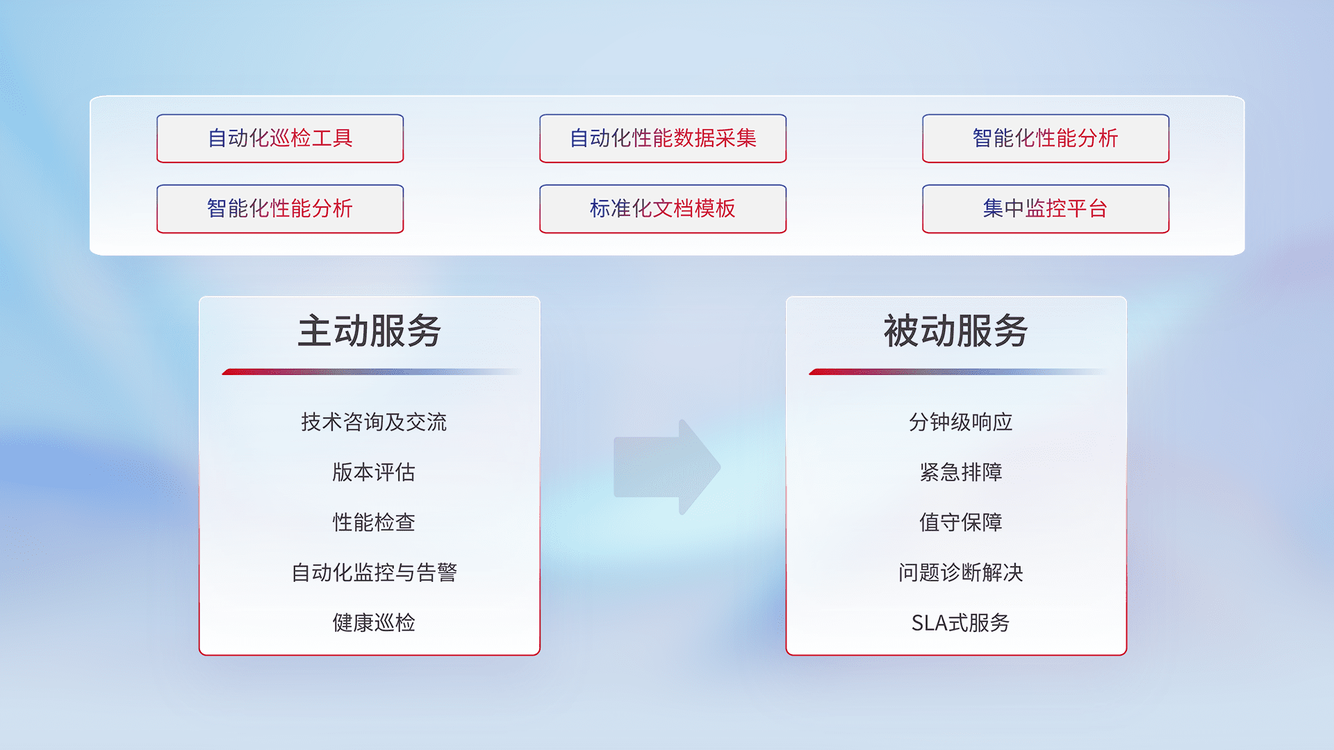 智能化工具和标准化文档,,,保障服务质量,,提供主动服务(包含技术咨询、、、版本评估、、性能检查、、、自动化监控与告警、、、健康巡检)和被动服务包含(分钟级响应、、、、紧急排障、、、、值守保障、、问题诊断解决、、、SLA服务)。。。